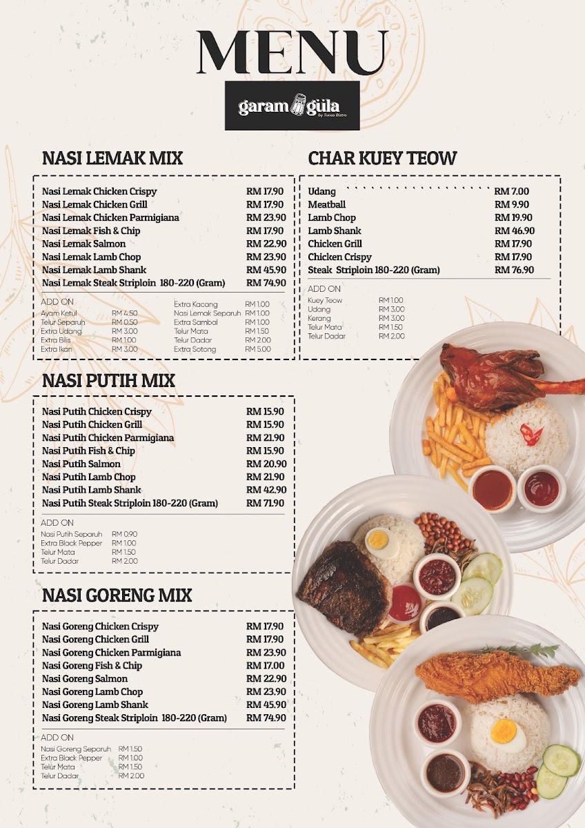 But the experience does not end there. Whether you are in the mood for a light snack or a fuller meal, you'll be pleased with the selection at Garam Gula. Try the famous Nasi Goreng, which has received rave reviews for its robust flavors, or perhaps the delectable Grilled Black Pepper Chicken that customers can’t stop raving about. To accompany your meal, the Cheezy Meatballs and crispy Fries are fantastic options that never fail to please. Dive into a bowl of their creamy Mushroom Soup for a comforting start to your meal.